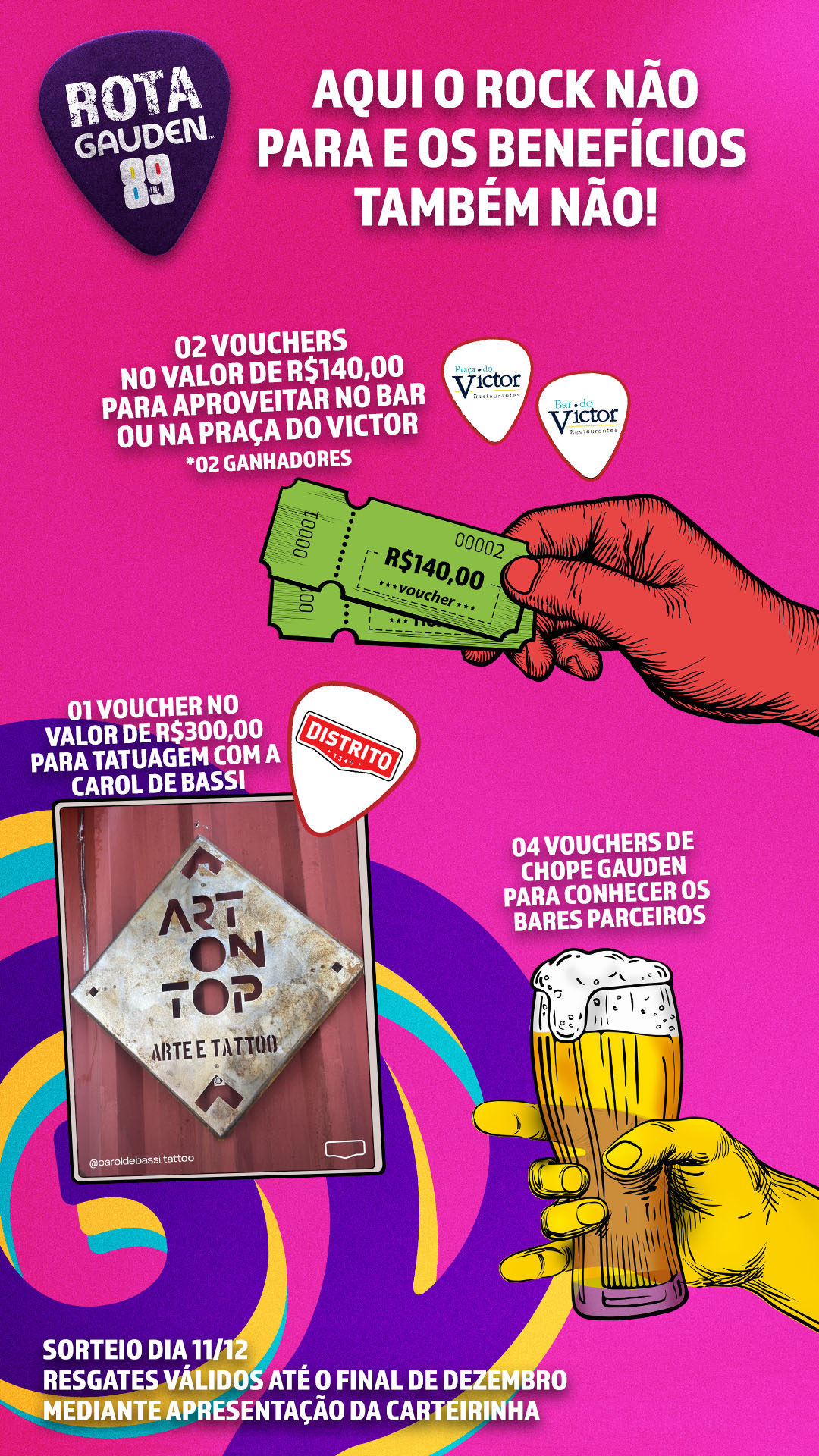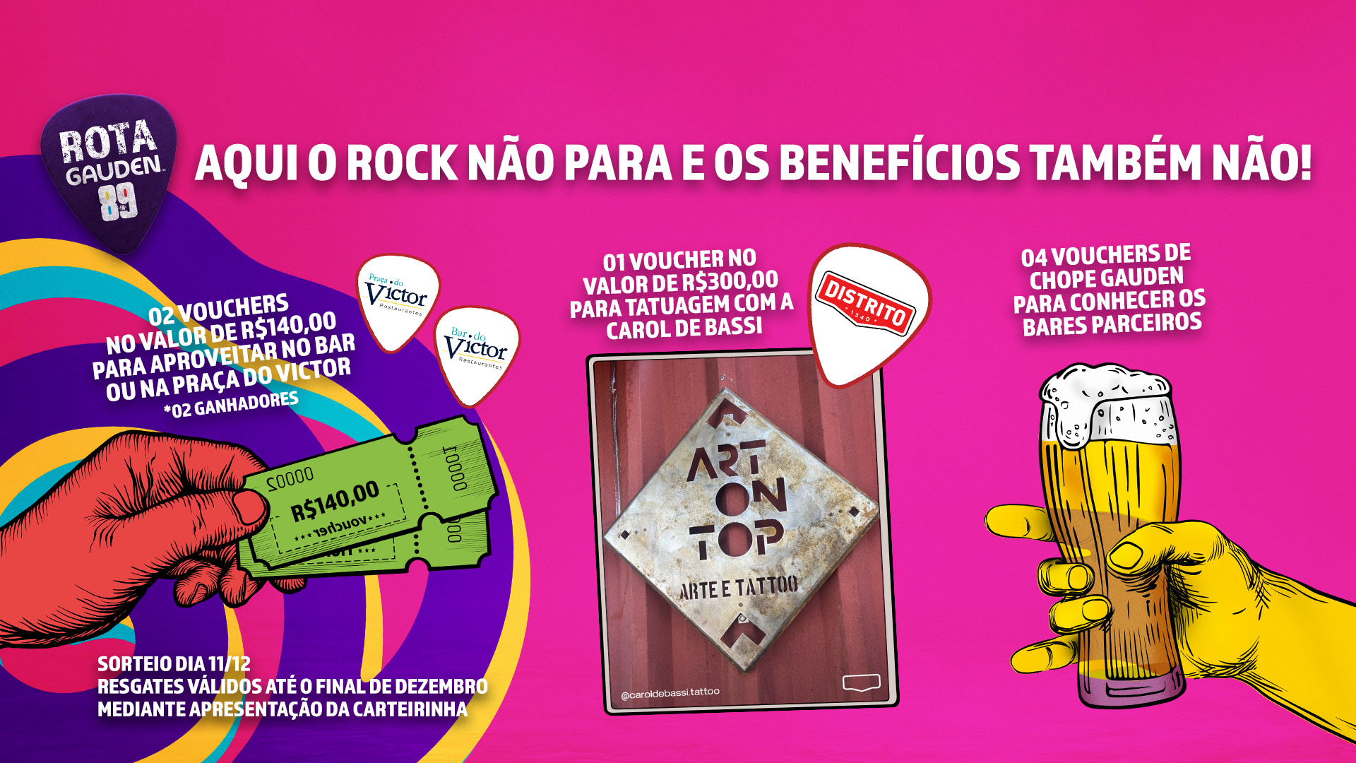 A ROTA GAUDEN 89 é uma plataforma colaborativa e única na cena Curitibana. Um roteiro que conecta bares, restaurantes e casas noturnas ao universo do rock, com experiências reais para o público, vantagens exclusivas e gratuitas, visibilidade promocional contínua em mídia e ativações; valorizando os estabelecimentos parceiros com grande engajamento e fluxo estimulado de clientes.